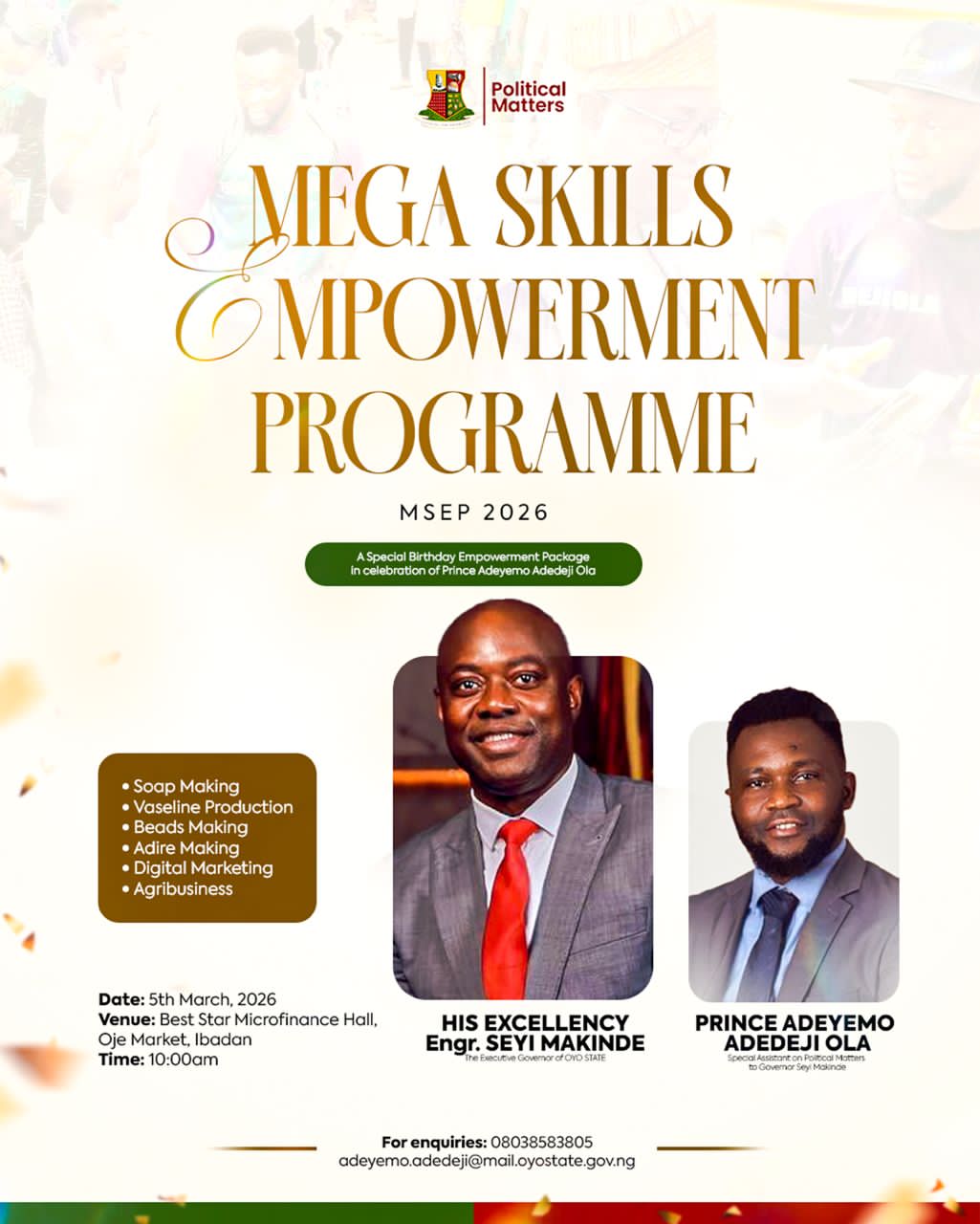 All is now set for the Mega Skills Empowerment Programme (MSEP) 2026, a Special Birthday Empowerment Initiative in celebration of Prince Adeyemo Adedeji Ola.